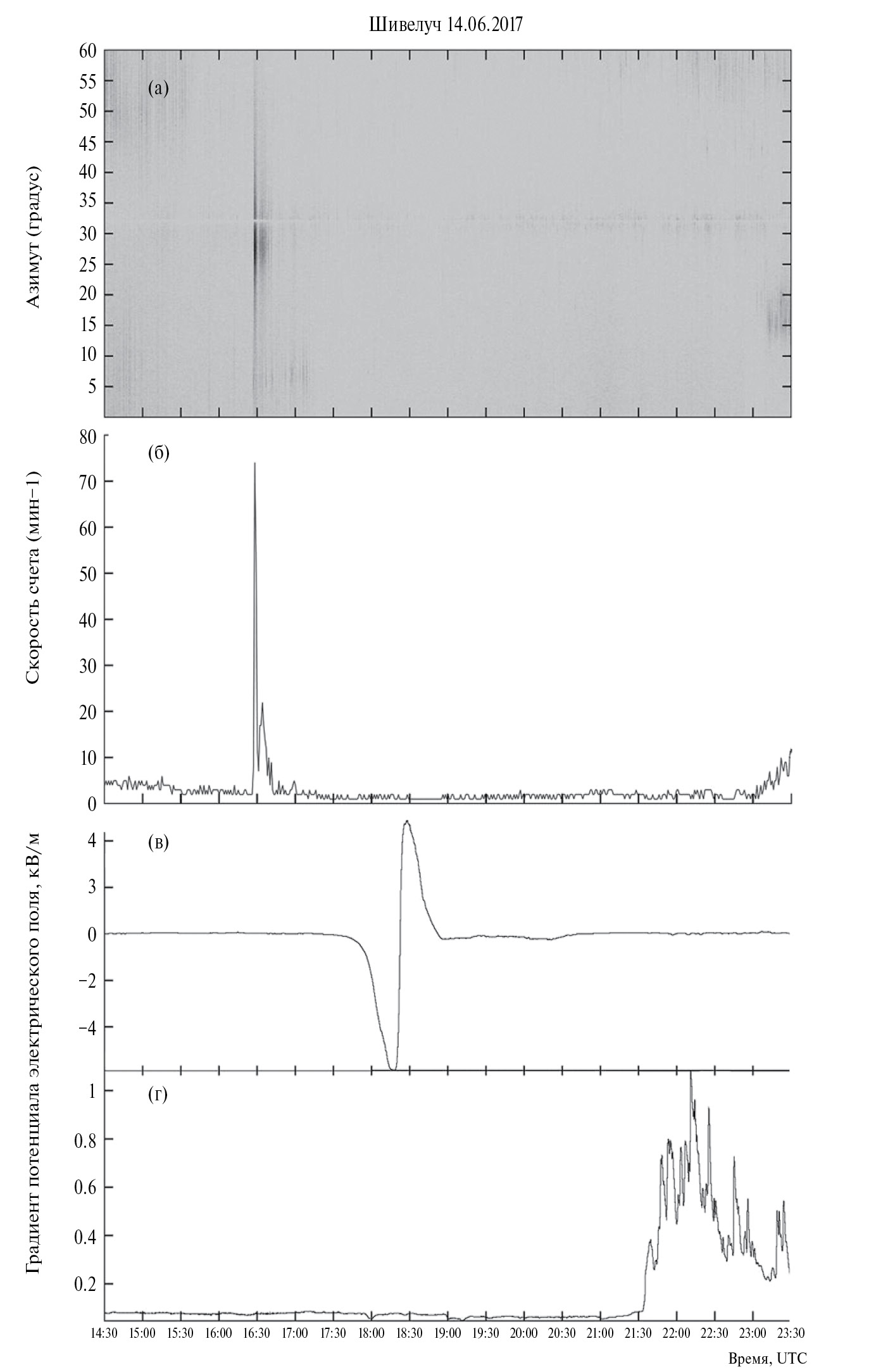 Рис. 6. Данные регистрации электромагнитных возмущений, сопровождающих извержение в. Шивелуч 14.06. 2017 г.
