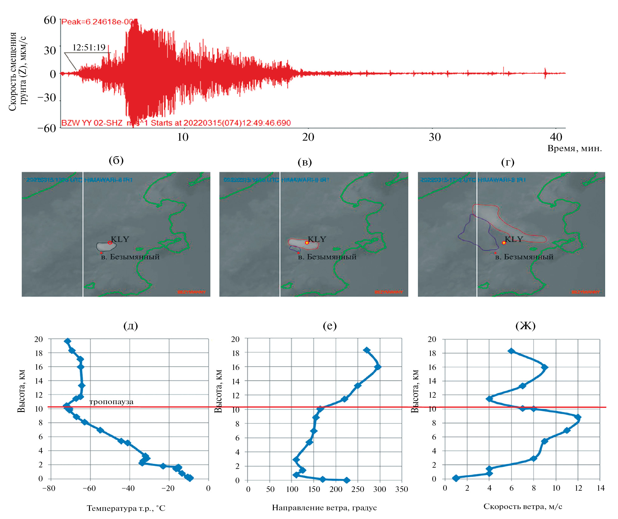 а – вертикальная компонента скорости смещения грунта сейсмического сигнала на BZW, сопровождавшего эксплозивное землетрясение 15.03.2022 г. в. Безымянный; б, в, г – стадии распространение эруптивного облака по данным спутниковых снимков HIMAWARI-8 (http://rammb.cira.colostate.edu): развитие эруптивного облака на 13:00 (б), 14:00 (в), 17:00 (г); д – данные высотного зондирования пос. Ключи 15.03.2022 12:00: температурная стратификация атмосферы; е, ж – ветровая стратификация атмосферы.