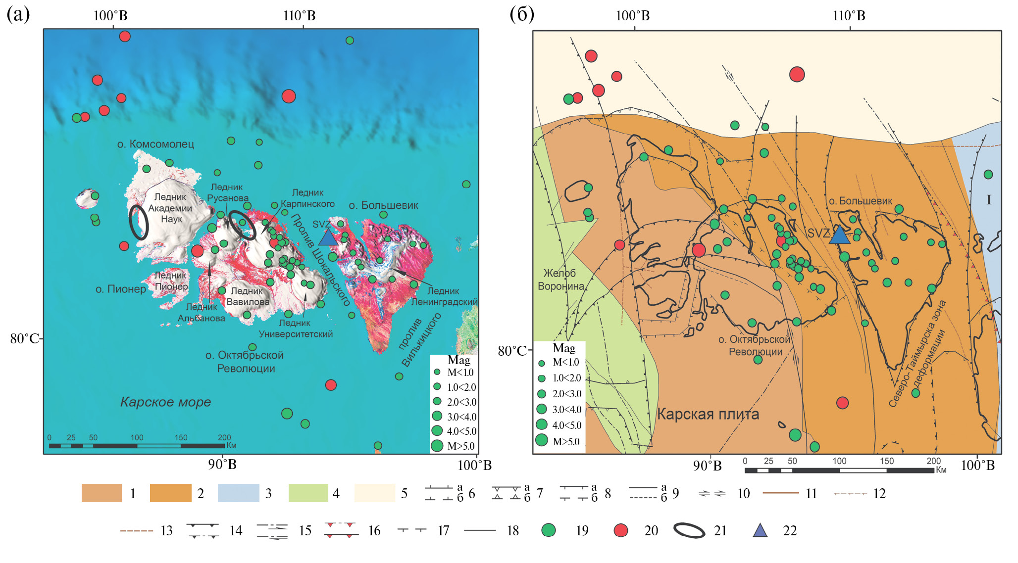 1–5 – литосферные плиты: 1 – с позднедокембрийским фундаментом, 2 – с позднедокембрийским фундаментом, подвергшиеся герцинским тектоническим деформациям, 3 – аккреционно-коллизионные комплексы, 4 – троги и склоны с корой переходного типа, 5 – современный континентальный склон; 6–9 – современные разломы [Атлас ..., 2004] (a – достоверные, б – предполагаемые): 6 – нормальные разломы, штрихи на опущенном крыле, 7 – взбросы, треугольники на приподнятом крыле, 8 – разломы неустановленного типа, штрихи на опущенном крыле, 9 – разломы без установленного смещения; 10 – стрелками показано направление смещения при сдвигах; 9–13 – разломы [Pubellier et al., 2018]; 11–13 – разломы [Arctic Petroleum Geology…, 2011]: 11 – активный спрединговый центр, 12 – нормальные разломы, 13 – неклассифицированные разломы; 14 – надвиг и взброс; 15 – сдвиговый сброс (стрелка – направление сброса); 16 – фронт деформаций для орогенов; 17 – нормальные листрические разломы; 18 – неклассифицированные разломы; 19, 20 – сейсмические события: 19 – зарегистрированные только станцией SVZ, 20 – включенные в сейсмический каталог; I – Таймырский аккреционный пояс; 21 – области образования айсбергов и ледников [Шапошников и др., 2017]; 22 – сейсмическая станция “Северная Земля” (SVZ).