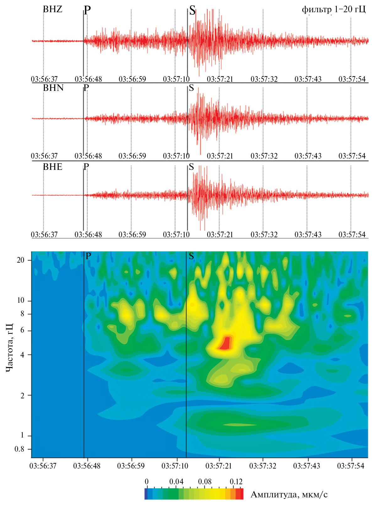 Рис. 2. Волновые формы для Z-, N- и Е-каналов и СВАН-диаграмма для Z-канала тектонического землетрясения, зарегистрированного станцией SVZ 31.03.2022 г. в районе о. Комсомолец.