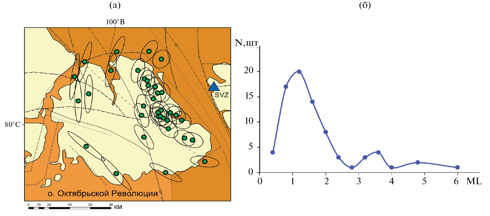 Эпицентры событий на о. Октябрьской Революции (N = 35 шт.) и оценка их погрешностей в виде эллипсов показаны на рис. 3а. Значения локальных магнитуд для этих событий находится в диапазоне от 0.2–2.3. Распределение магнитуд всех зарегистрированных станцией SVZ событий (N = 73 шт.) показано на рис. 3б. Оно отображает недостаточность данных с магнитудами ниже 1.2, но дает представление о том, что в совокупности событий возможно два вида толчков, дающих максимум на ML ~1.5 и значения ML >3.