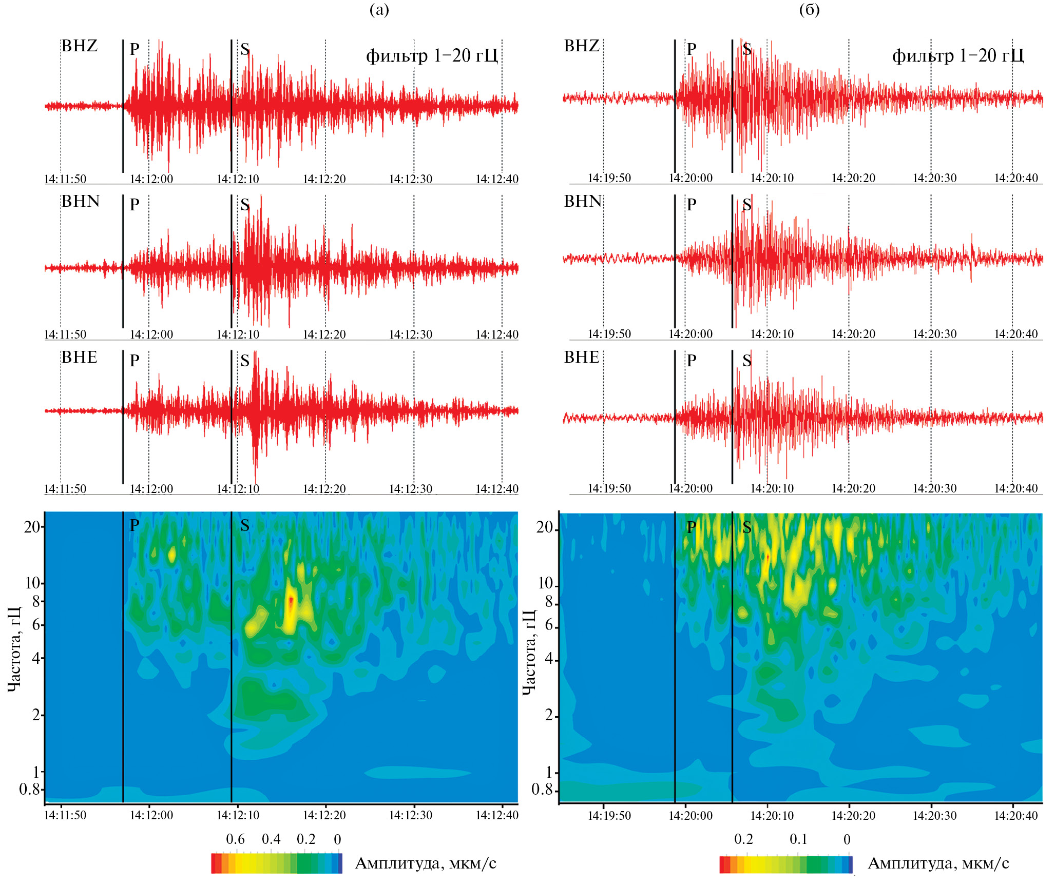 Рис. 4. Волновые формы для Z-, N- и Е-каналов и СВАН-диаграммы локальных сейсмических событий, зарегистрированных SVZ (а – группа A, б – группа В).