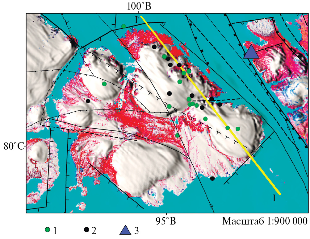 В соответствии с плотностной моделью земной коры вдоль профиля Северная Земля–Поднятие Менделеева [Каминский, 2009] в районе арх. Северная Земля осадочные породы залегают до 3 км, далее, до глубин 18 км, выделают гранодиоритовую верхнюю кору, а ниже, до 31 км, – базитовый нижний слой земной коры.