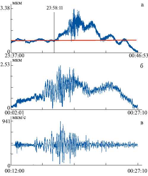а ‒ фрагмент записи лазерного деформографа длительностью 137 мин, б – увеличенный фрагмент записи регистрации землетрясения лазерным деформографом, в – фрагмент записи широкополосного сейсмометра.