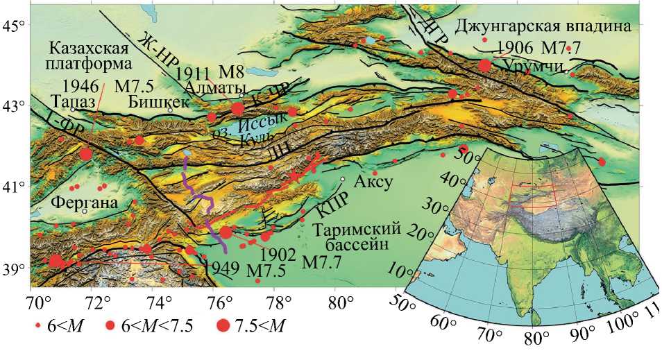 Красной линией показана разломная зона Майдантаг (МДР); черные линии – основные разломы Тянь-Шаня [Wu et al., 2019], из которых индексами обозначены: Ж-НР ‒ Жалаир-Найманский разлом, КПР ‒ предгорный разлом Калпинтаг (Кепинг), ДГР ‒ Главный Джунгарский разлом, ЛН ‒ Линия Николаева (Nalati), ТФР – Таласо-Ферганский разлом, К-ЧР ‒ Кемин-Чилик; фиолетовая ломанная линия – трасса сейсмического профиля MANAS [Макаров и др., 2010]; красные круги – эпицентры исторических землетрясений из каталога USGS, для наиболее сильных из них указан год и магнитуда.