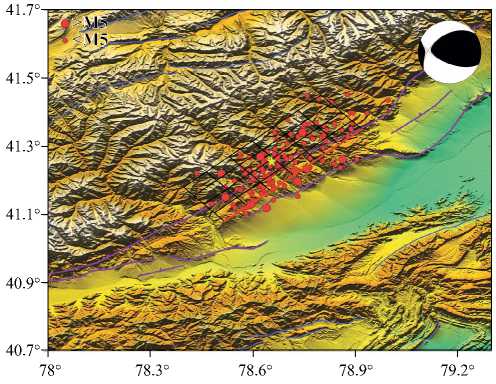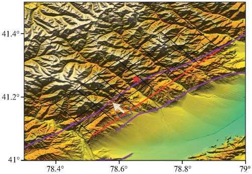 Сейсмический профиль MANAS (см. рис. 1, фиолетовая линия), проходящий несколько западнее землетрясения Айкол, выявил поддвиг Таримского бассейна под Тянь-Шань на расстояние более 50 км [Макаров и др., 2010]. На этом профиле зона поддвига по разломам Калпинтаг и Майдантаг отчетливо прослеживается до подошвы земной коры под всей системой поднятий Кокшаалтау. Эта зона поддвига часто трактуется как главный элемент Южно-Тянь-Шаньской системы дислокаций [Макаров и др., 2010]. В то же время детальные исследования показали, что значительное сокращение и сдвиговые деформации происходят и внутри Тянь-Шаньской горной системы [Li et al., 2021]. Землетрясение Айкол произошло в районе северо-восточной ветви разломной зоны Майдантаг (см. рис. 1, красные линии).