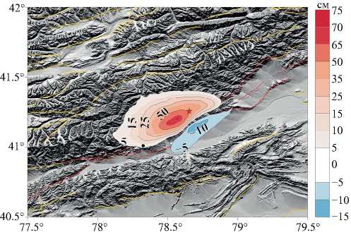 Смещения в направлении на спутник находятся в пределах от –13 до 72 см (положительные в сторону спутника). По морфологии поля смещений можно заключить, что смещения произошли по разлому, падающему на северо-запад, близкому по простиранию к первой нодальной плоскости NP1 в решении USGS (простирание 235°, падение 45°, угол подвижки 42°). Действительно, в случае надвига по вертикальному разлому области поднятий и опусканий имеют одинаковый размер и величину смещений. По мере уменьшения угла падения надвига, область поднятия над его висячим крылом расширяется, величина поднятия увеличивается, а область опускания становится меньше и по размеру, и по величине смещений. Простирание разлома всегда близко к простиранию линии, разделяющей области поднятия и опускания. В результате углы падения и простирания поверхности разрыва четко контролируются полем смещений.