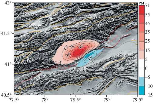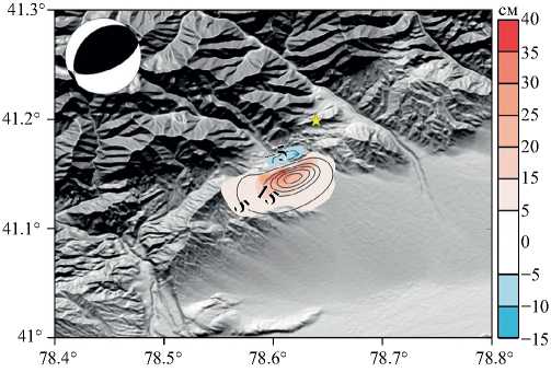 На рис. 6 показана карта смещений в направлении на спутник в см, изолиниями показаны смещения по модели главного афтершока. Эпицентр землетрясения по сейсмологическим данным сдвинут относительно определенной нами очаговой области на несколько км на северо-восток. Это, возможно, связано с ошибками определения параметров очага для относительно небольших землетрясений, расположенных в удаленных горных районах.