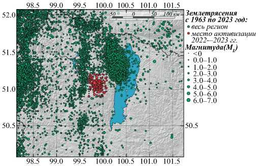 Рис. 3. Карта землетрясений западной окраины Байкальской рифтовой зоны в 1963–2023 гг.