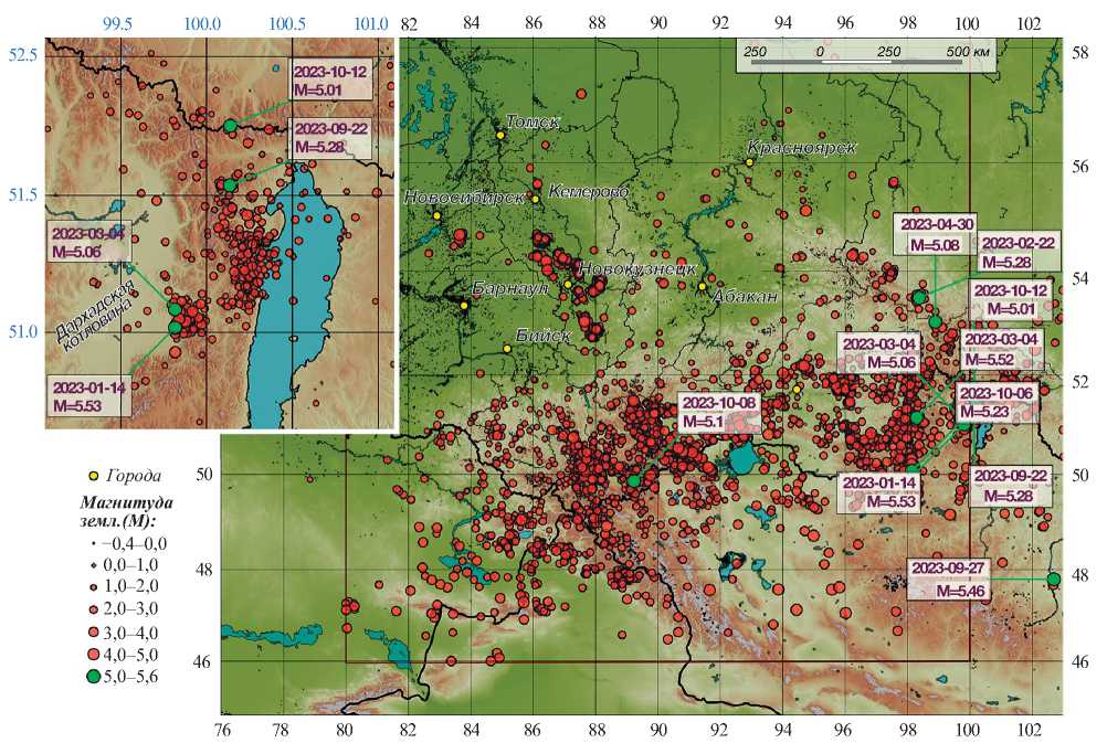 Рис. 2. Карта эпицентров Алтае-Саянской горной области в 2023 г. Врезка – район Хубсугульского землетрясения.