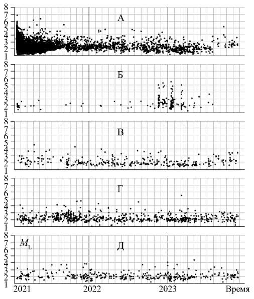 А – эпицентральная зона Хубсугульского землетрясения 2021 г.; Б – Дархадский рой землетрясений; В – эпицентральная зона Белин-Бий-Хемского землетрясения 2008 г.; Г – эпицентральная зона Бусингольского землетрясения 1991 г.; Д – эпицентральная зона Тувинских землетрясений 2011–2012 гг.