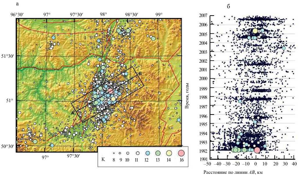 а — карта эпицентров землетрясений района Бусингольского землетрясения; б — пространственно-временное развитие афтершокового процесса вдоль оперяющего разлома. Снос событий выполнен на центральную линию прямоугольника (см. рис. 7а) по перпендикуляру со всей площади прямоугольника.