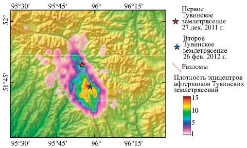 Рис. 10. Карта плотности эпицентров афтершоков Тувинских землетрясений.