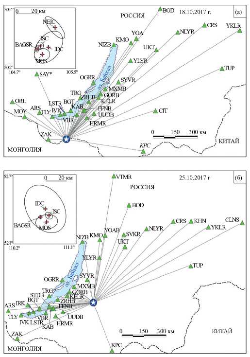 Рис. 2. Положение эпицентров землетрясений 18.10.2017 г. (а) и 25.10.2017 г. (б) (кружок со звездочкой) относительно региональных сейсмических станций, данные которых использовались при обработке материалов наблюдений.