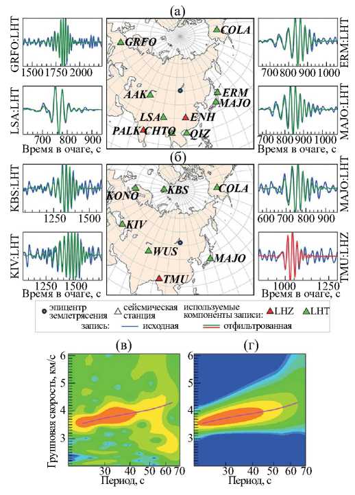 Амплитудные спектры поверхностных волн определялись с помощью метода спектрально-временного анализа (СВАН) [Левшин и др., 1986], представляющего собой аналог многоканальной узкополосной фильтрации. Диапазон периодов, в котором поверхностные волны выделялись наиболее надежно, подбирался для каждой станции отдельно. Для большинства станций он составил 30–65 с, за исключением станции GRFO для первого землетрясения и KONO для второго, на которых фильтрация была выполнена в более узком диапазоне – 30–50 с. Примеры исходных и отфильтрованных записей, а также соответствующие СВАН-диаграммы LHT-компоненты станции MAJO приведены на рис. 3б, 3в, 3г.