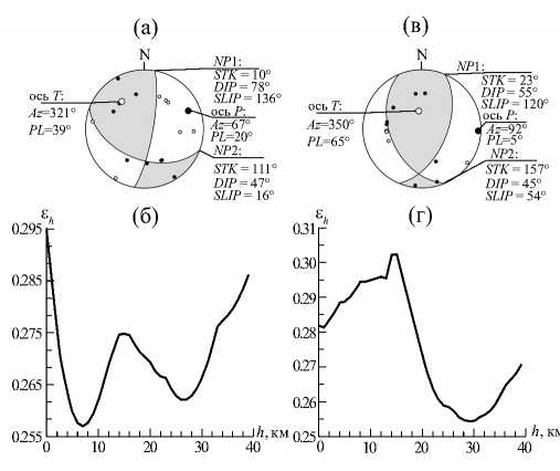 Качество полученных оценок очаговых параметров оценивалось с помощью функции нормированной невязки (ε) [Lasserre et al., 2001], характеризующей отличие синтетических амплитудных спектров от наблюденных и показывающей отношение числа знаков первых вступлений P-волн, не удовлетворяющих полученному решению фокального механизма, к общему числу используемых знаков. Для оценки разрешения определяемых параметров также строились частные функции нормированной невязки. Для этого расчеты проводились лишь для одного параметра (например, глубины – εh на рис. 4б, 4г), а остальным присваивались фиксированные значения, обеспечивающие минимум функции ε.