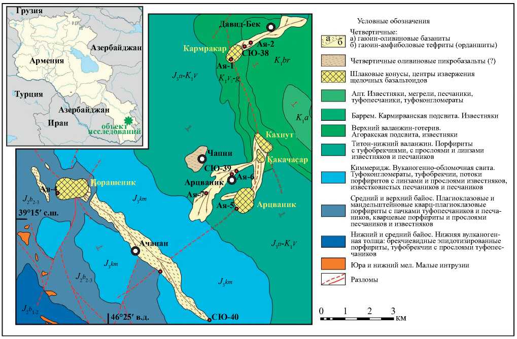 На территории Малого Кавказа большинство проявлений новейшего щелочного основного вулканизма приурочено к юго-восточному окончанию Сюникского нагорья (южная часть Армении) и связано с активностью Капанского неовулканического центра (рис. 1).