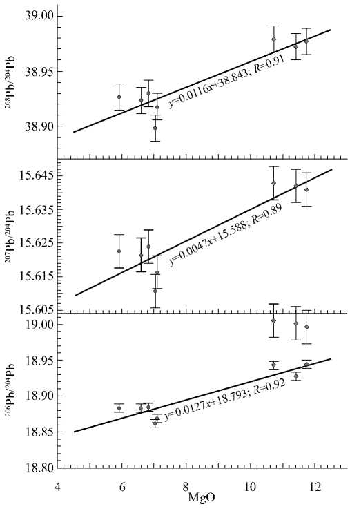 Изотопный состав Pb анализировался методом многоколлекторной масс-спектрометрии с индуктивно-связанной плазмой (МС-ICP-МС) на приборе NEPTUNE (ThermoFinnigan) А.В. Чугаевым. Данный метод [Rehkämper, Halliday, 1998] предполагает анализ свинца из растворов, содержащих добавку таллия, и нормирование результатов текущих измерений изотопных отношений свинца по стандартному значению отношения 205Tl/203Tl, которое принимали равным 2.3889±1 [Чернышев и др., 2007]. Точность и правильность получаемых результатов контролировались систематическими анализами стандартных образцов горных пород Геологической службы США – AGV-1 и BCR-1. За время проведения измерений были получены следующие значения изотопных отношений Pb в стандартах: AGV-2 – 206Pb/204Pb = 18.871±5; 207Pb/204Pb = 15.621±4; 208Pb/204Pb = 38.548±10, n = 5; BCR-1 – 206Pb/204Pb = 18.822±6; 207Pb/204Pb = = 15.640±4; 208Pb/204Pb = 38.737±12, n = 10. Итоговая аналитическая погрешность (±2SD) для отношений 206Pb/204Pb, 207Pb/204Pb и 208Pb/204Pb не превышала 0.03 отн. %.