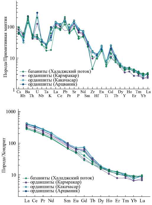 Изученные вулканиты содержат 41.2–45.5 мас. % SiO2, 4.4–7.6 мас. % Na2O + K2O при 0.6–3.1 мас. % K2O; на диаграмме TAS [Le Bas et al., 1986] точки их составов в подавляющем большинстве располагаются в поле базанитов/тефритов (табл. 2, рис. 4). Породы обогащены крупноионными литофильными элементами (LILE) (Ва от 930 до 1550 г/т, Sr от 1850 до 4050 г/т), имеют повышенные содержания S (до 1.99%) и P2O5 (от 0.91 до 1.95%); отношения Nb/Ta в них близки к хондритовым, либо несколько превышают последние (17.8–26.9). Орданшиты региона заметно дифференцированы (0.57–0.63 Mg#), базаниты – близки к составу примитивных расплавов (0.70–0.71 Mg# при Fo89‒90 оливина вкрапленников), равновесных с мантийным источником.