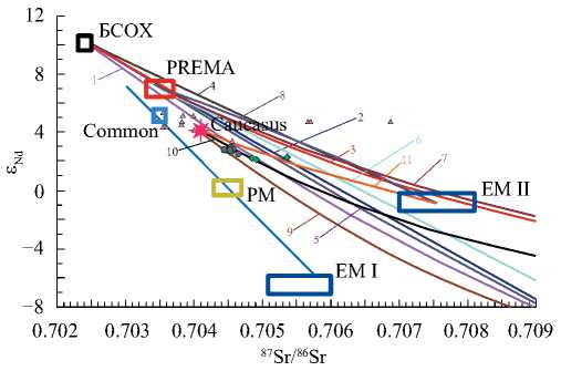 - Jackson M.G., Dasgupta R. Compositions of HIMU, EM1, and EM2 from global trends between radiogenic isotopes and major elements in ocean island basalts // Earth and Planet. Sci. Lett. 2008. V. 276. P. 175–186.