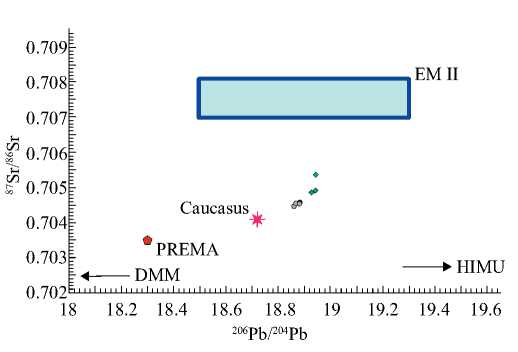 The first ever detailed data are obtained on the Sr–Nd–Pb isotope systematics and geochemistry of Quaternary intraplate hauyne basanites and ordanshites in the Lesser Caucasus. The parental magmas of the rocks were found out to have been generated by mixing material from at least two regional sources: one relatively depleted and the other significantly enriched in incompatible elements. One of these sources of the hybrid magmas was most likely a mildly depleted regional plume–asthenospheric source of the CAUCASUS OIB type, whose isotopic-geochemical signatures were close to those of the COMMON and PREMA mantle reservoirs. The other source of the material for the rocks was relatively enriched in radiogenic Sr and Pb and depleted in radiogenic Nd and was most probably enriched subcontinental lithospheric mantle of the EM II type.