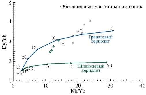 Как было отмечено в предыдущем сообщении, практически для всех разностей изученных пород фиксируются сильно фракционированный спектр тяжелых РЗЭ (высокие отношения (Gd/Yb)n = 3.23–10.30) (рис. 1), низкие Lu/Hf (0.05–0.08) и высокие Ti/Y (316.55–671.72) отношения, которые указывают на присутствие граната (Grt) в качестве реститовой фазы в мантийном источнике. На это же указывает и Nb–Dy–Yb систематика щелочных базальтоидов Капанского центра. Как видно из диаграммы Nb/Yb–Dy/Yb (рис. 2), плавление шпинелевого (Spl) лерцолита обогащенного мантийного источника [Neill et al., 2013; Fitton, Godard, 2004] не может воспроизвести составы щелочных базальтоидов Капанского центра. Напротив, модельная кривая парциального плавления Grt-лерцолита [Neill et al., 2013] пересекает поле составов изученных пород при доле плавления обогащенного источника для получения составов материнских магм орданшитов от 6 до 10% и базанитов – от 10 до 15% (см. рис. 2).