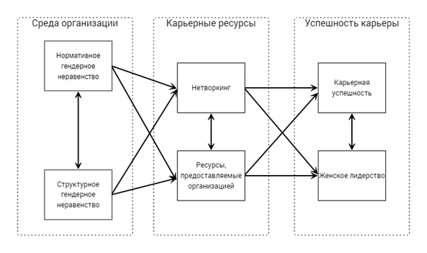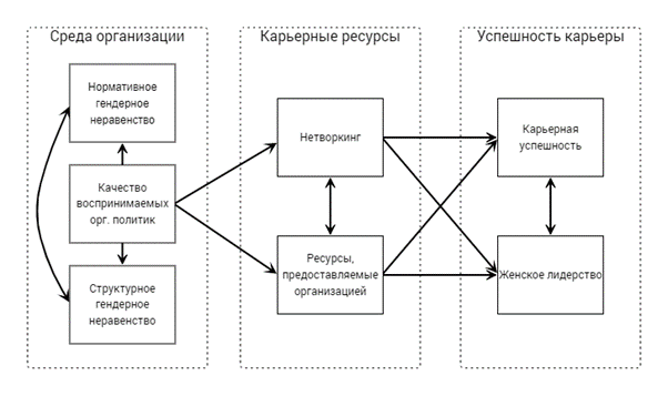 В ряде исследований было показано, что гендерная дискриминация влияет на карьерные ресурсы женщин: так, например, результаты исследования 2016 года [13] показывают, что гендерная дискриминация отрицательно связана с рабочими ресурсами организации, с преобладанием мужчин (что может быть признаком структурных гендерных барьеров), так и в организации с гендерным балансом. Карьерная успешность связана с наличием таких ресурсов, как соответствие личности организационной культуре, психологическая безопасность, развивающее менторство, доступность продвижения [19]. Недостаточный доступ к ресурсам организации уменьшает карьерную успешность сотрудников [26]. Таким образом, можно предположить, что гендерное неравенство в нормах и в структуре организации влияет на ресурсы, предоставляемые организацией работающим в ней женщинам, вследствие чего снижается удовлетворенность работой и субъективная карьерная успешность.