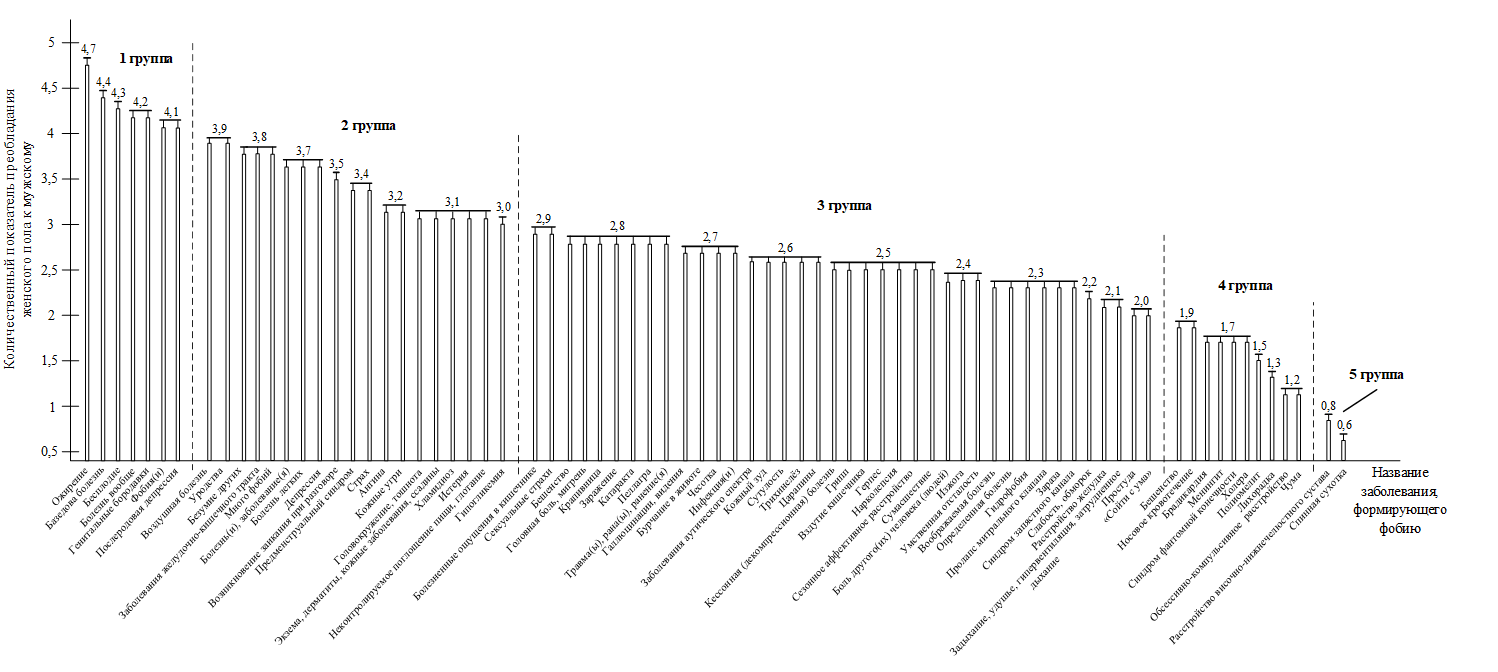 Гистограмма наглядно демонстрирует (по численному соотношению) четыре условных группы заболеваний, одинаково вызывающих страх у мужчин и женщин. Принципом такого деления явились принцип распространенности в сочетании с принципом преобладания той или иной фабулы фобии у одного из полов. В первую группу заболеваний, вызывающих наибольший страх, согласно результатам исследований, попали коронавирусная инфекция и онкологическо(и)е заболевание(я) (рак). Информация об этих болезнях у мужчин и женщин, помимо ФТ, может обусловливать тревожно-депрессивные расстройства со значительной соматогенной астенией, повышенной утомляемостью и слабостью, частота которых достигает 40% случаев [19]. Эти болезни, на общем тревожном фоне, являются триггером страха и стресса, детерминируя возникновение пароксизмов тревоги [11].