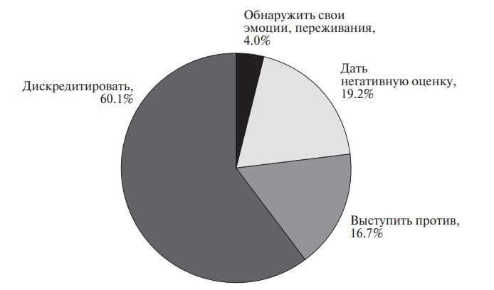 Оценка полученных данных по шкале интенсивности негативных интенций [10] обнаруживает преобладание интенций блока дискредитации — “оскорбить”, “обвинить”, “высмеять” и др. (точный критерий Фишера, p < 0.00001), которые обладают наибольшей интенсивностью (рис. 1)