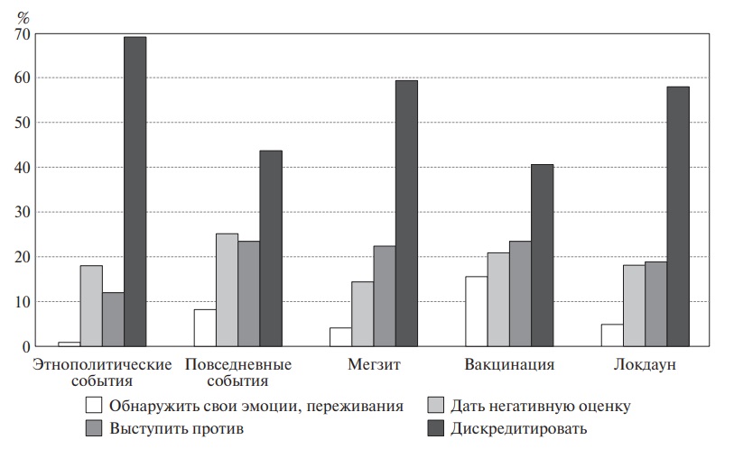 Примечание. Частота реализации негативных интенций при обсуждении этнополитических событий (2015–2017 гг.) — 1332, повседневных событий (2018–2019 гг.) — 462, Мегзита (2020 г.) — 205, вакцинации от COVID-19 (2021 г.) — 174, локдауна (2021 г.) — 409.