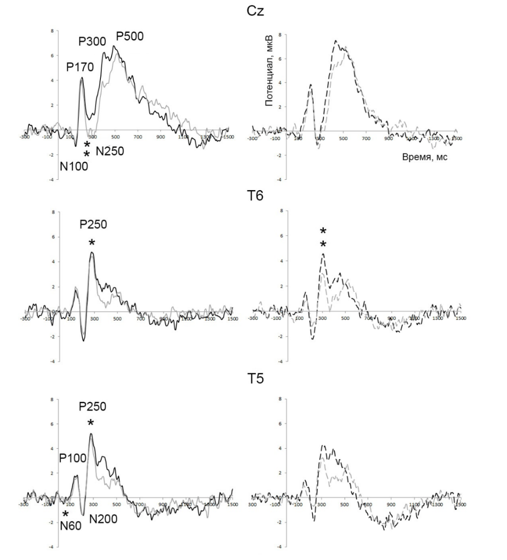 Рис. 2. Усредненные вызванные потенциалы, зарегистрированные у людей с шизофренией в центральном отведении (Сz), в затылочно-височном отведении слева (T5) и справа (Т6) при категоризации изображений объектов живой (чёрная линия) и неживой (серая линия) природы, отфильтрованные по низким (А) и по высоким пространственным частотам (Б). Звездочками показаны достоверные различия в зависимости от уровня значимости при сравнении соотношения амплитуд одного компонента внутри каждой группы по низким и высоким пространственным частотам. Уровень значимости: * — p < 0.05; ** — p < 0.01