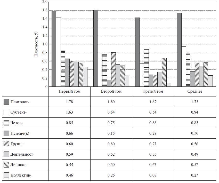 В табл. 2 представлен результат анализа определенных морфем, входящих в понятия, включенные в трехтомник “Разработка понятий современной психологии” [12–14]. Выделение морфем было осуществлено по ключевым словам, а ниже представлены наиболее общие для них морфемы (их количество и плотность, то есть частота встречаемости морфемы в общем объеме текста, выраженная в процентах).