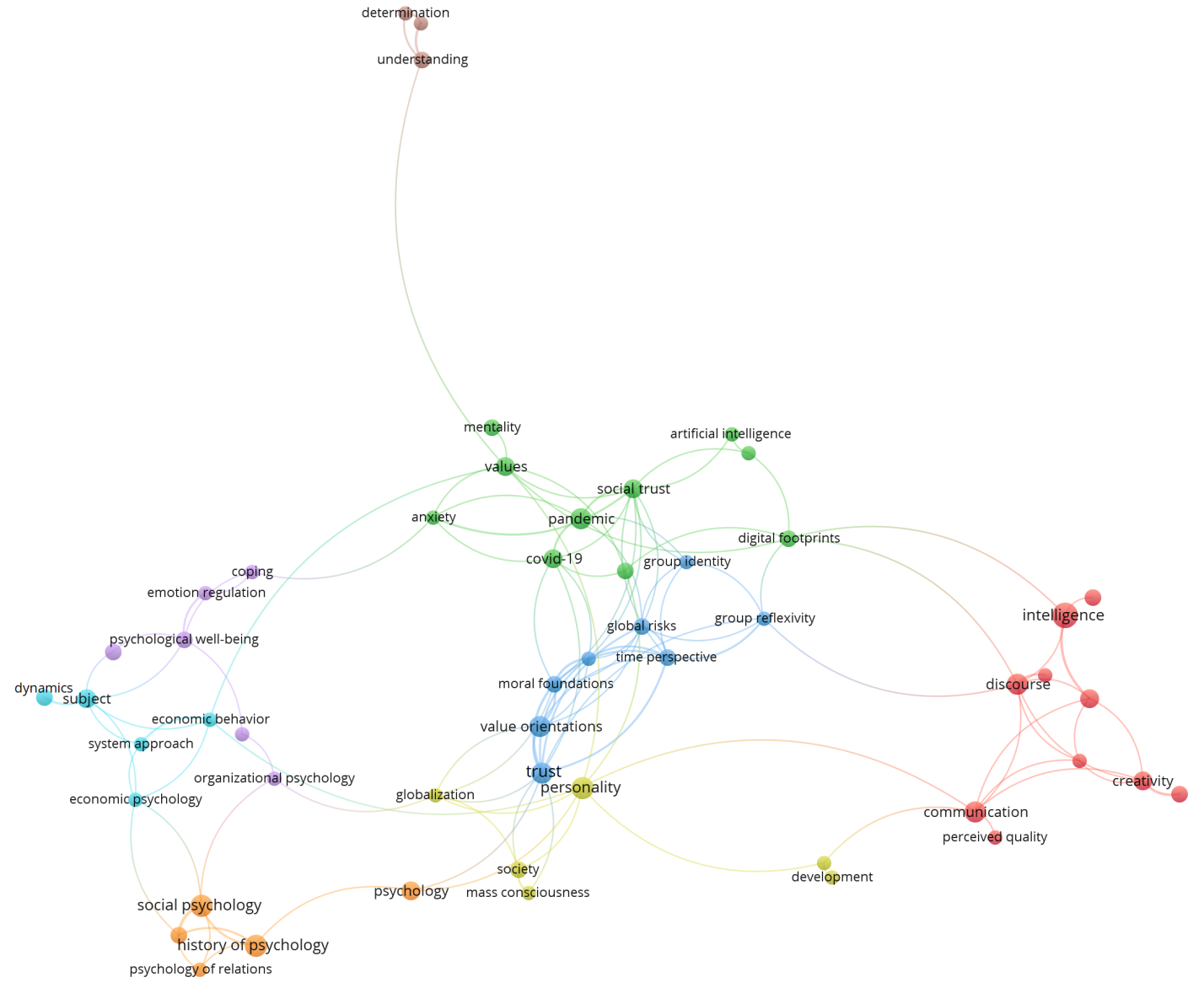 Серьезными ограничениями такого типа анализа являются и рамки, заданные ключевыми словами и аннотациями. Более того, статистические процедуры также оставляют за рамками возможности совмещения количественного анализа “веса” и плотности взаимосвязей понятий с их содержанием. Однако представляется, что визуализация сетевой структуры организации современных понятий и их тематической кластеризации может служить подспорьем для теоретико-методологической работы психологической науки.
