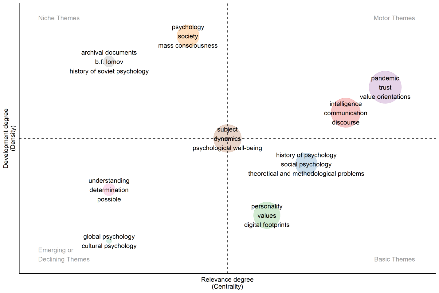 В правом нижнем углу — основные (базовые) темы: важные для всей области, но внутри себя менее проработанные (часто в силу общего характера). Это — история психологии, социальная психология, теоретические и методологические проблемы, личность, ценности, цифровые следы. В центре кластерной карты сосредоточены понятия субъекта, движущих сил и психологического благополучия. Такое центральное положение этих понятий при кластеризации может указывать на их значение для всех тематических кластеров: как для нишевых тем, так и для возникающих и продвигающих предметное поле, а также базовых тем.