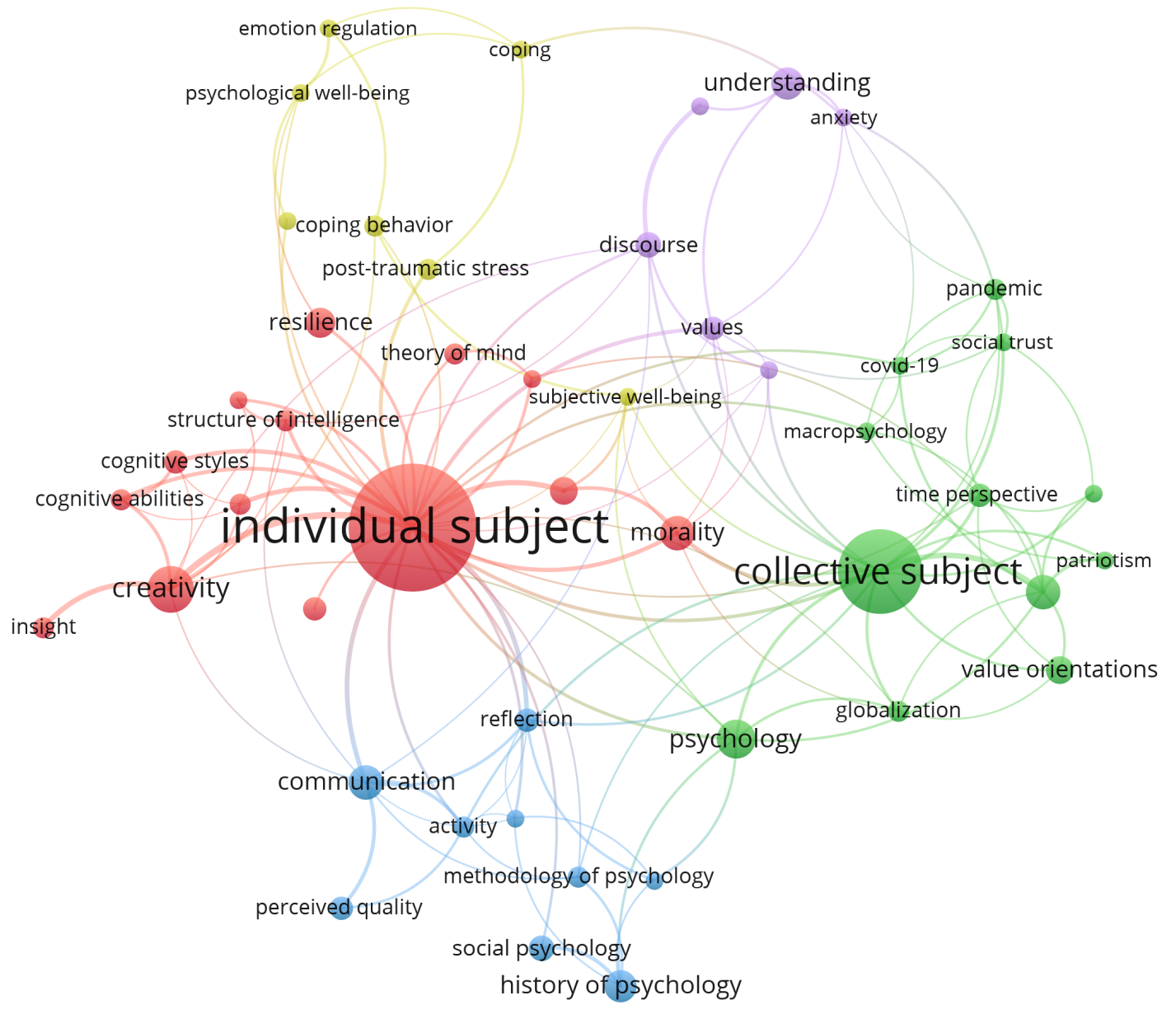 Также следует обратить внимание на то, что при построении понятийной карты на основе авторских ключевых слов публикаций, индексированных в Scopus, “стягивания” терминов в комплексы, которые могут быть обозначены как индивидуальный и коллективный субъекты, обнаружить не удалось. Таким образом, возможно, что подобное “стягивание” для ключевых слов публикаций сборника ограничено только теми понятиями, которые разрабатывают авторы, а не является отражением внутренней понятийной динамики предметного поля психологии. В этом контексте необходимо отметить ограниченные возможности библиометрического анализа, который не позволяет выявить иерархические отношения между понятиями. В любом случае, даже если бы в ходе количественного анализа удалось свести все понятийное поле к двум кластерам, которые условно можно было бы обозначить как “индивидуальный субъект” и “коллективный субъект” (а этого сделать не удалось), остался бы открытым вопрос о том, являются ли они фундаментальными метапонятиями, отражающими исторически сложившееся разделение психологии на индивидуальную и коллективную части, или просто представляют собой числовые фикции. Очевидно, что ответ на этот вопрос не может быть найден в результатах библиометрического анализа.