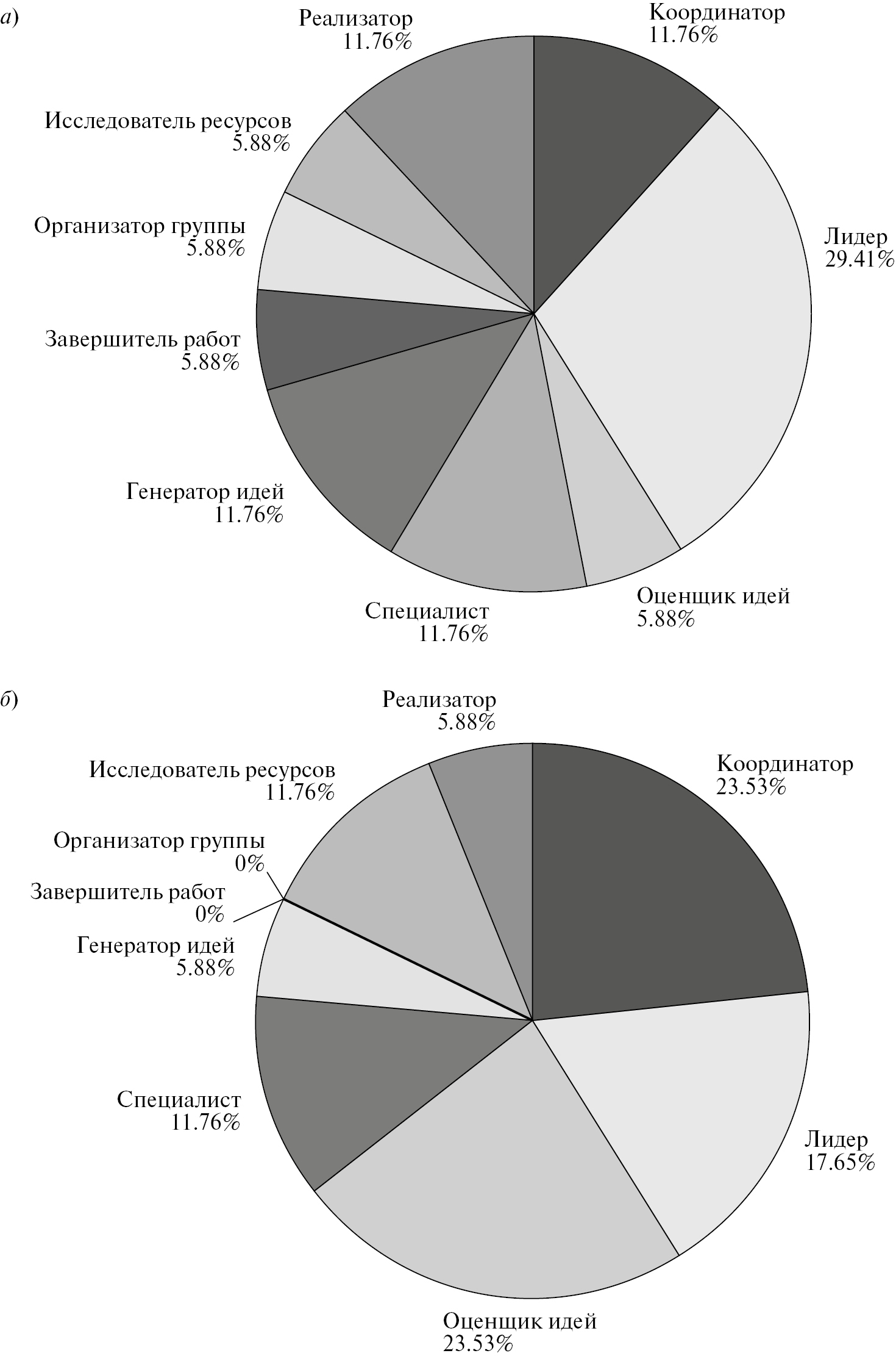 Рис. 9. Выбор умеренно-абнотивными респондентами основных (а) и дополнительных (б) командных ролей