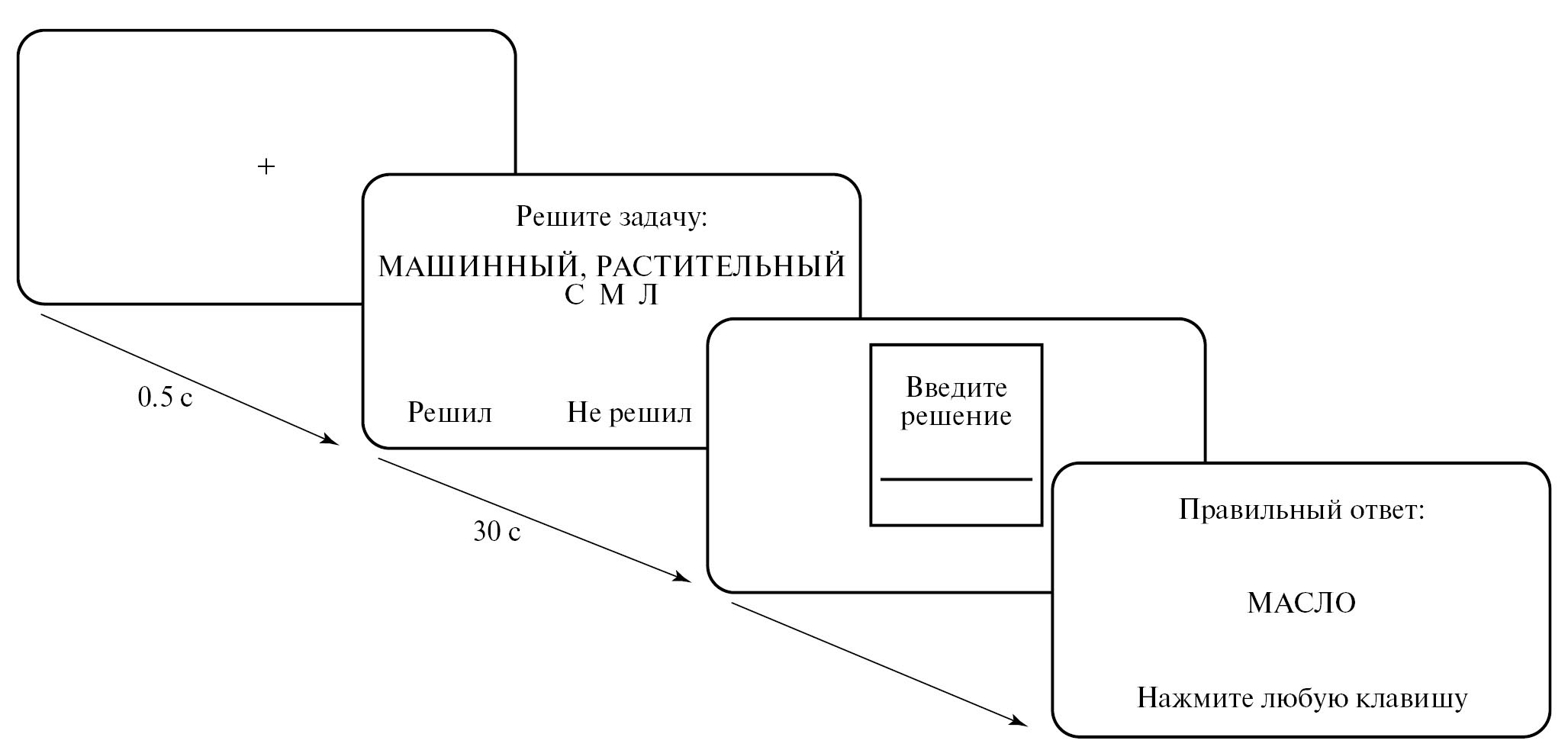 Следует отметить, что методики, используемые в современных работах, для настоящего исследования не подходят. Это связано с тем, что авторы в основном исследуют факторы, влияющие на механизмы поиска решения, но не на формирование результата. Это предпочтение отражается в методологии этих работ. В исследованиях используются подсказки, помогающие или мешающие найти решение [19; 20; 26], семантический прайминг, влияющий на субъективное переживание, связанное с решением [23], и т.д.