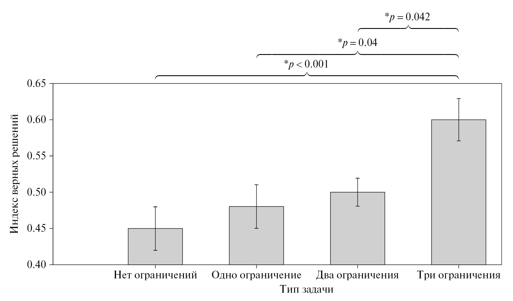 Сравнения по критерию Шеффе продемонстрировали достоверные различия между индексами решения задач без ограничений и задач с тремя ограничениями (p < 0.001), индексами решения задач с одним ограничением и задач с тремя ограничениями (p = 0.041), индексами решения задач с двумя ограничениями и задач с тремя ограничениями (р = 0.042) (рис. 2).