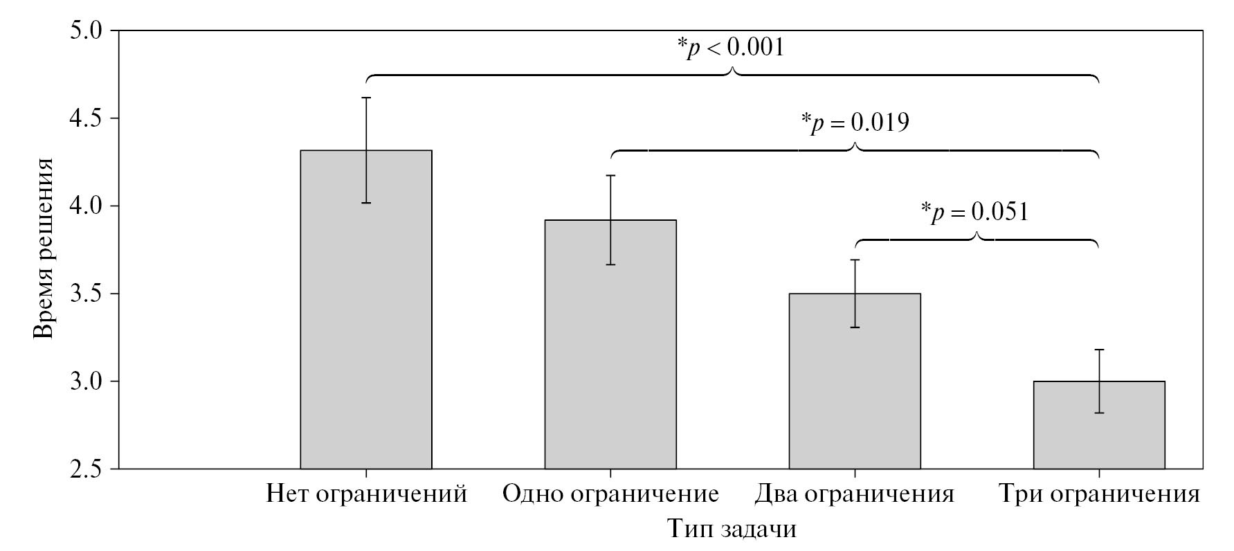 Множественные сравнения по критерию Шеффе продемонстрировали достоверные различия между задачами без ограничений и задачами с тремя ограничениями (p < 0.01), задачами с одним ограничением и задачами с тремя ограничениями (p = 0.03), а также задачами с тремя ограничениями и задачами с двумя ограничениями (p = 0.03). В остальных случаях достоверных различий не обнаружено (задачи без ограничений vs задачи с одним ограничением: p = 0.9; задачи без ограничений vs задачи с двумя ограничениями: p = 0.62; задачи с одним ограничением vs задачи с двумя ограничениями: p = 0.9).