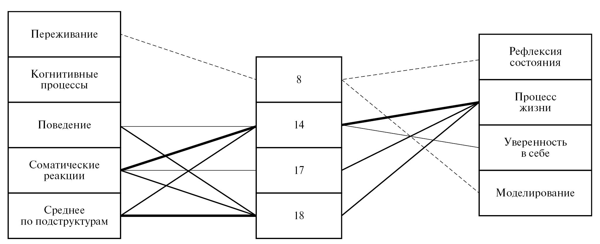 Рис. 2. Ментальная регуляция психических состояний студентов I курса в повседневной ситуации обучения Условные обозначения. Слева на рисунке представлены подструктуры психических состояний, по центру — способы саморегуляции, справа — ментальные структуры и регуляторные свойства личности; 8 — концентрация внимания на другой деятельности; 14 — самоконтроль; 17 — переустановка на “рабочее” состояние; 18 — использование настроев; p ≤ 0.01; р ≤ 0.05; прямые связи; обратные связи
