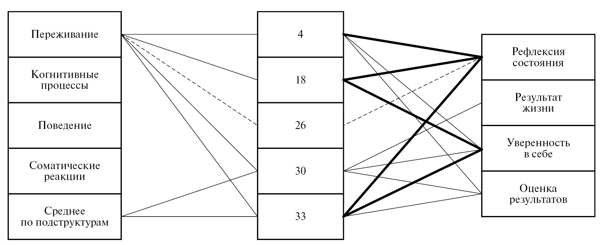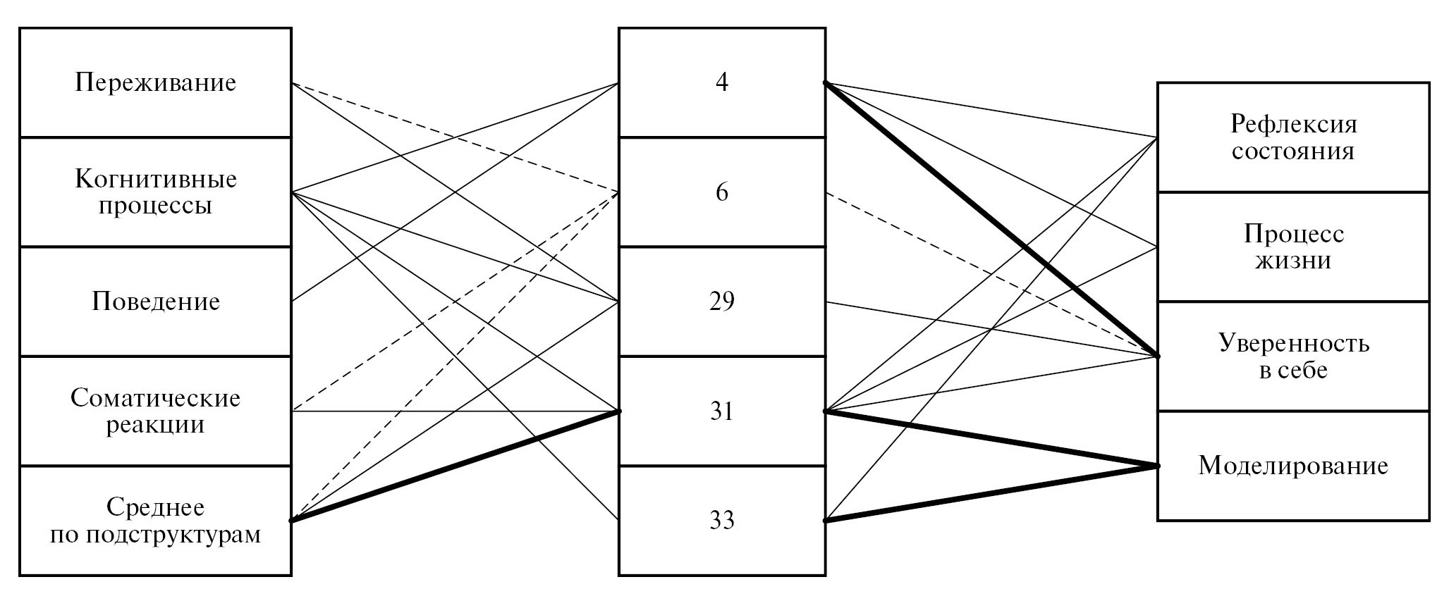 Тем не менее к старшему курсу обучения число применяемых в напряженной ситуации способов саморегуляции резко возрастает (рис. 5), значительно увеличивается включенность ментальных структур в их выбор. В этом случае системообразующими показателями становятся способность студентов к рефлексии собственных состояний и уверенность в себе. Значимость смысловых структур снижается, а на передний план выходит удовлетворенность жизнью (результат жизни). Акцент взаимосвязей способов саморегуляции и регуляторных свойств смещается в сторону адекватности оценки полученных результатов.