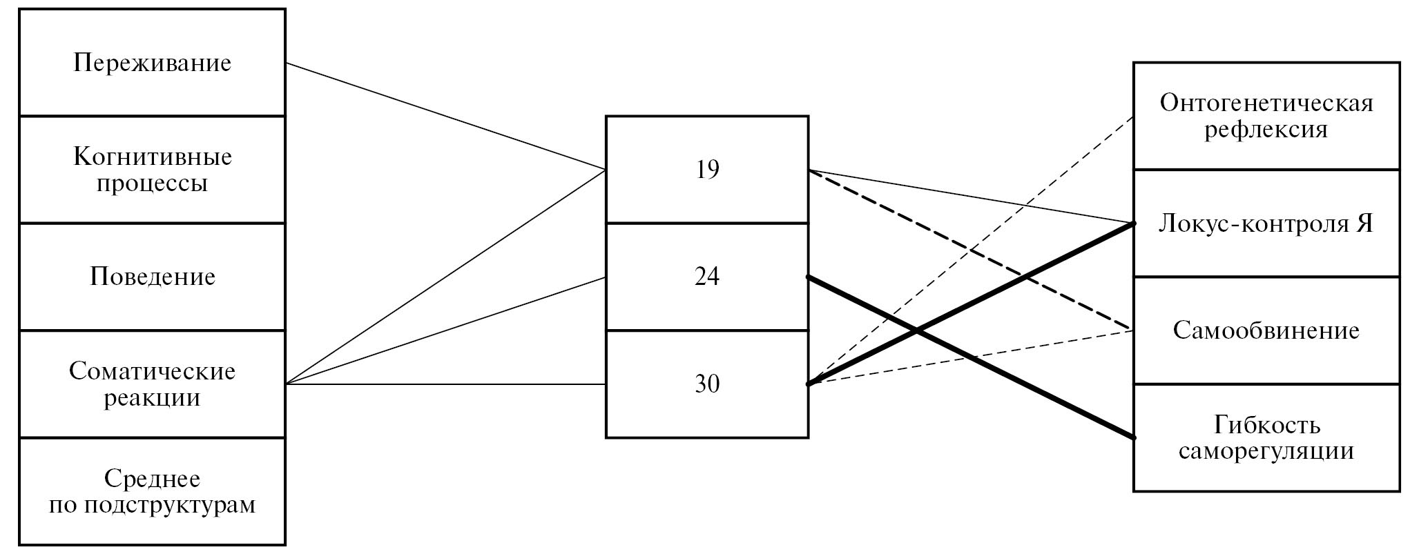 Рис 4. Ментальная регуляция психических состояний студентов I курса в напряженной ситуации обучения Условные обозначения. 19 — повышение собственной мотивации; 24 — медитация; 30 — изменение отношения к ситуации; p ≤ 0,01; р ≤ 0,05; прямые связи; обратные связи