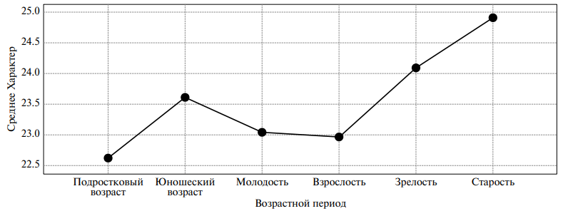 Эти показатели последовательно увеличиваются от подросткового возраста к зрелости, после чего снижаются в старости. Расчет Н-критерия Краскела—Уоллиса показывает статистическую значимость данных различий (Н = 11.051, р = 0.050).