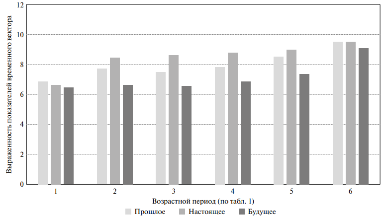 Рис. 7. Выраженность идентификаций, направленных на прошлое, настоящее, будущее в рамках шкалы “Временной сектор”