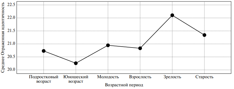 Таким образом, зафиксировано несколько возрастных переломных моментов в динамике показателей личностной идентичности (кризис юности 17–21 года, кризис взрослости 39–45 лет, кризис зрелости 55–65 лет).