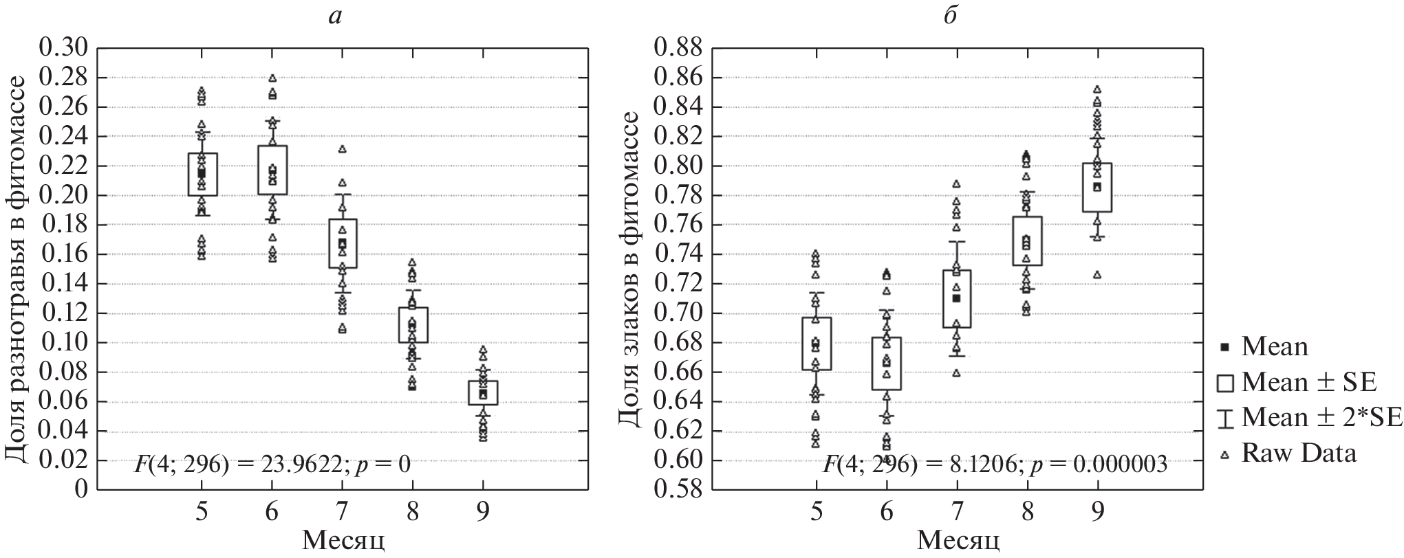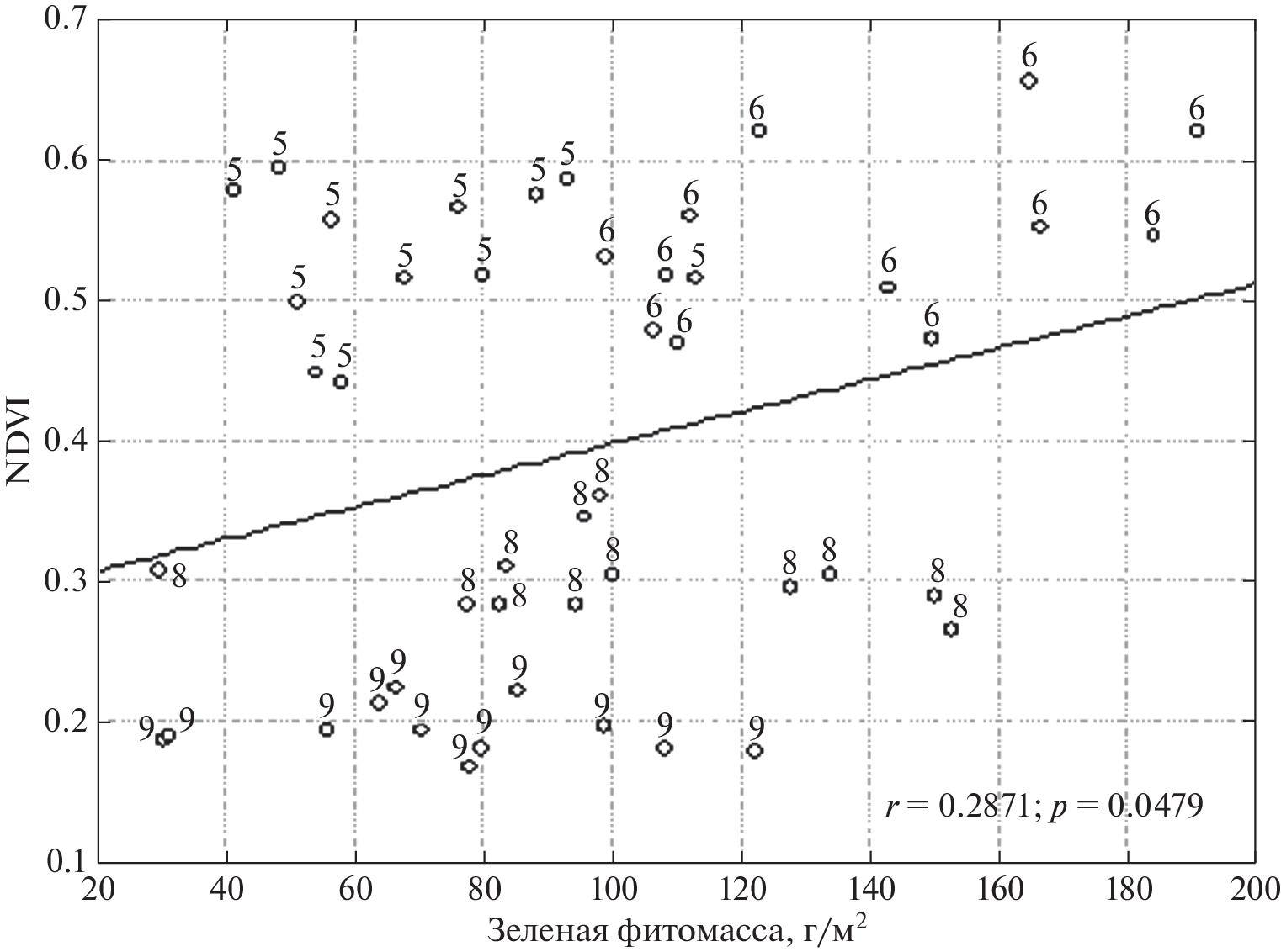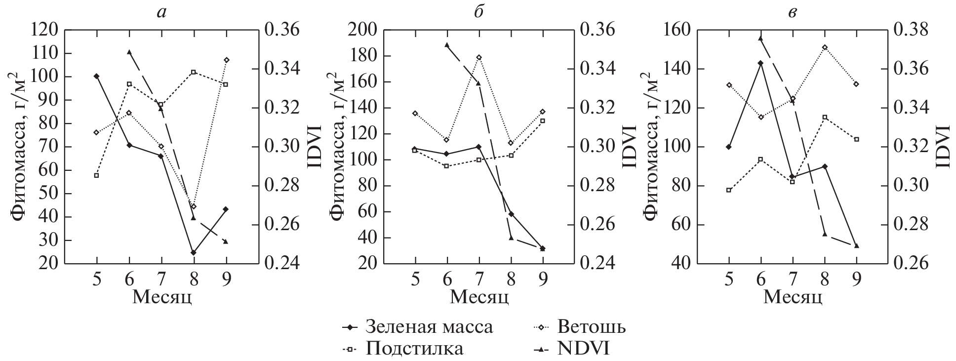 The complexity of phytomass measurements on sample plots hinders the extrapolation of plot-related data to areas comparable to land use or landscape units. Vegetation indices calculated from satellite images are usually considered as indicators of green phytomass and are used for its areal estimates. The study solves the problem of establishing the information content of the normalized difference vegetation index NDVI depending on the fractional structure of living and dead aboveground phytomass, seasonal dynamics of the biological cycle, hydrothermal conditions and landscape position. We used the results of monthly measurements of aboveground phytomass fractions at 13 sites covered by Stipa zalesskii and Stipa lessingiana formations in the Burtinskaya steppe (Orenburgsky nature reserve) from May to September in 2015–2020. For each period, NDVI values were calculated from Landsat satellite images at all sites. Hypotheses about geobotanical, hydrothermal, phenological and landscape factors of NDVI informativity were tested by using the Spearman correlation coefficients, analysis of variance and multiple regression. The discrepancy between the seasonal peaks of NDVI and green phytomass is not consistent with the common opinion of a direct indicator value of NDVI. The total live biomass correlates more clearly with the index in June and July but weaker at the end of the season. NDVI turned out to be sensitive not so much to green phytomass as such, but to the mass and proportion of forbs and the ratio of live and dead phytomass. In late spring and early summer, NDVI is most closely associated with forbs while in July – with grasses. The hypothesis about the possibility of screening green mass with standing dead biomass was confirmed, which leads to a decrease in NDVI despite the absence of a decrease in green phytomass. NDVI may underestimate the real green phytomass if there is a sharp increase in the mass of dead biomass, usually in the second half of summer and early autumn. NDVI more adequately reflects the state of the aboveground phytomass of steppe communities that have not been exposed to fires for a long time, compared to burned communities and fallows.