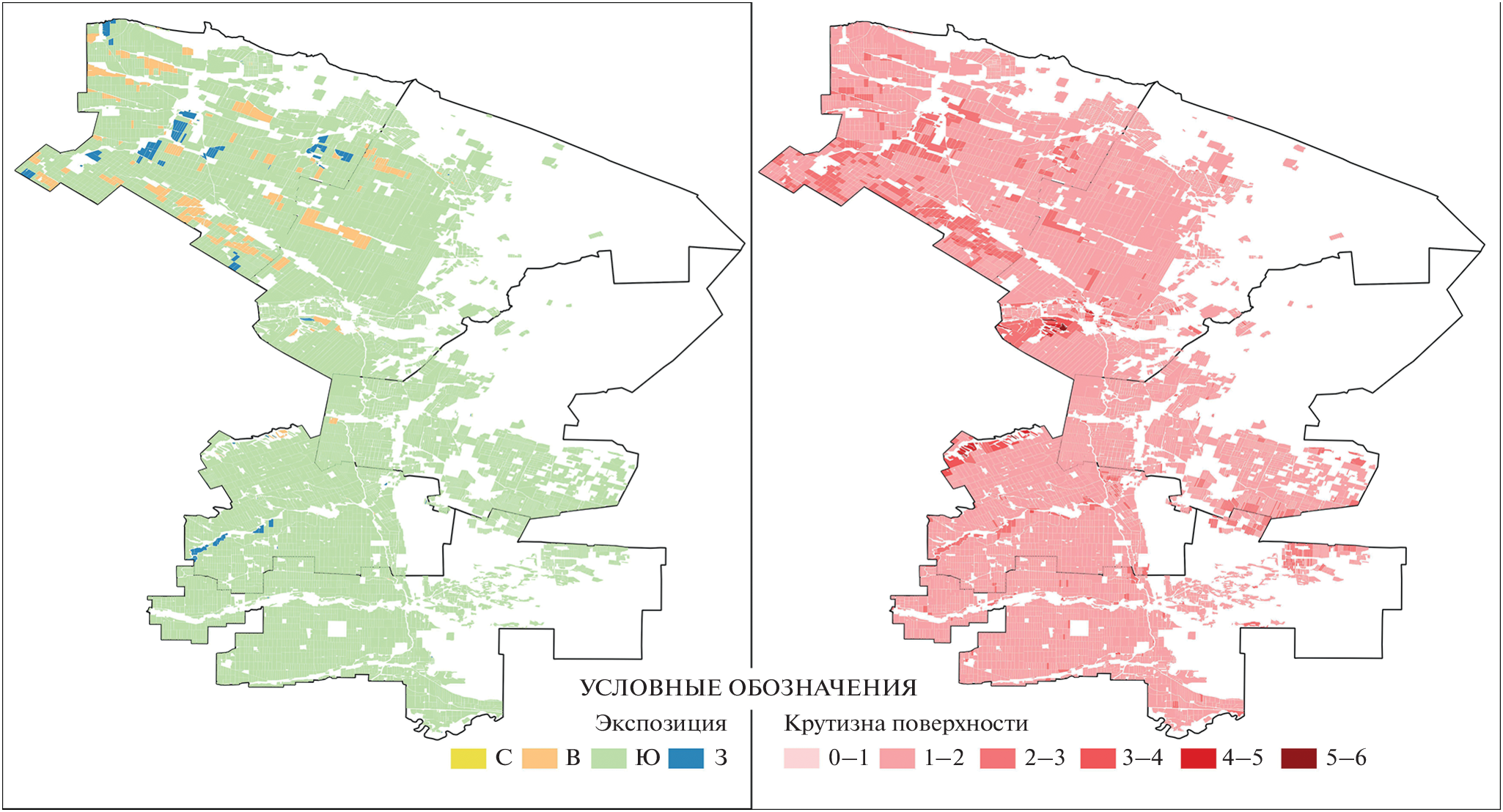 In total, 7.444 fields with a total area of 857.9 thousand hectares were mapped on the territory of five eastern arid regions of the Stavropol Territory. As of 2021, arable land occupies more than 55% of the study area and is located mainly in its western part. Winter crops occupy 4.693 fields with a total area of more than 487 thousand hectares (56.9% of the total field area). Mapping of the contours of the fields was carried out on the basis of satellite images “Sentinel-2” (“natural colors”). The morphometric characteristics of the fields were calculated on the basis of the SRTM3 DEM. Mask of winter crops for the period 2011–2021 and weekly composites with data on the NDVI value for spring (March–May) were obtained using the Vega-Science service. The areas of the fields identified according to remote sensing data are comparable with official statistics. The fields are located on lands with a steepness of up to 5°, the steepness of 1°–2° prevails (about 90% of the total area). Most fields have a predominant southern exposure, there are no fields with a northern exposure. There are 13 kinds of soils on the territory of the study area, chestnut deep soils predominate. Average NDVI for March–May 2011–2021 It shows the highest values in fields located on meadow soils, the lowest NDVI values are observed on salt flats and salt marshes. It was revealed that the NDVI value decreases with increasing field size, the optimal field size is up to 150 hectares. The highest NDVI values were found in fields with a steepness of 1°–2°, southern exposure and meadow, chestnut and light chestnut soils. The influence of annual precipitation amounts on the NDVI value is analyzed.