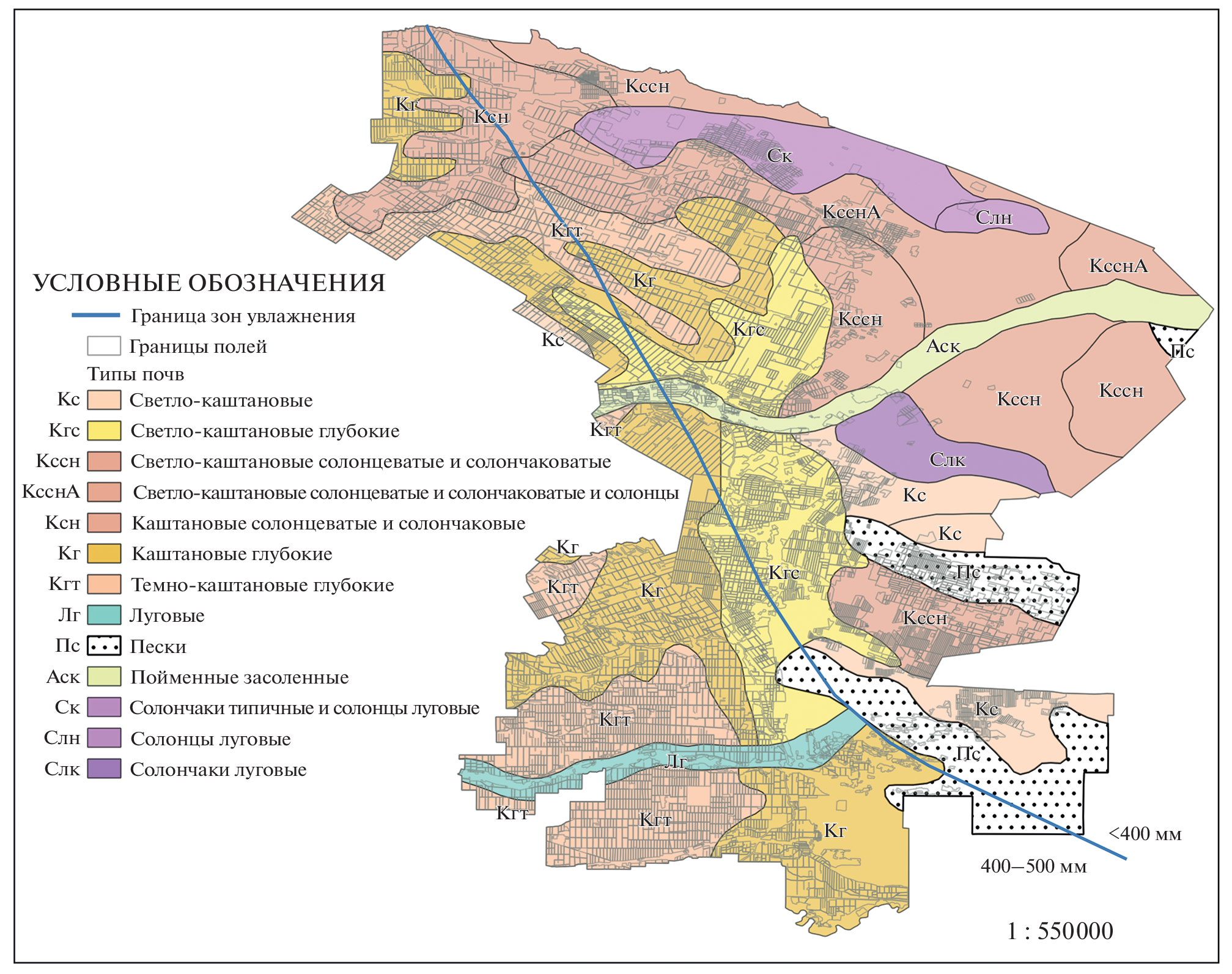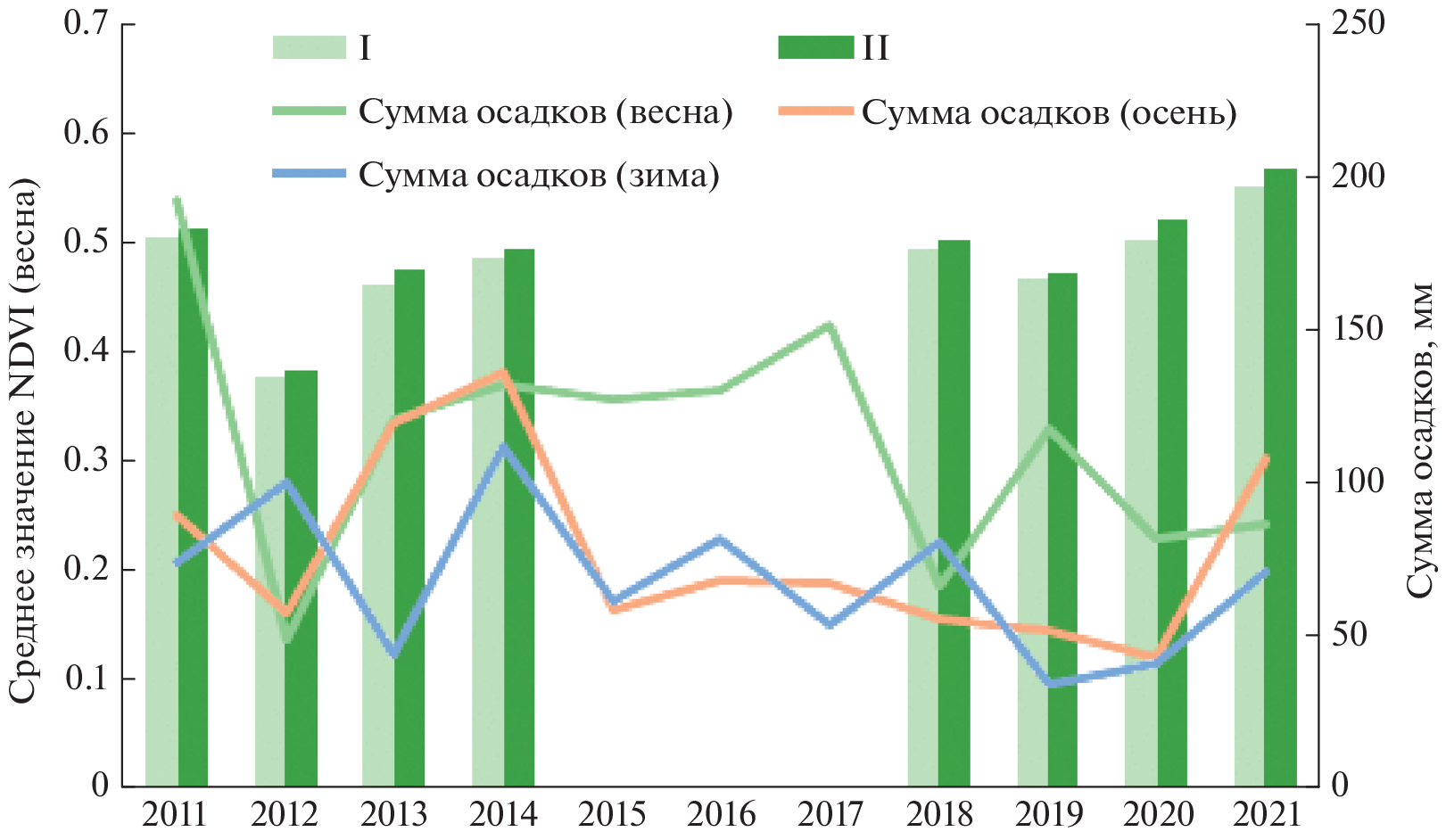 Всего картографировано 7444 полей общей площадью 857.9 тыс. га на территории пяти восточных засушливых районов Ставропольского края. По состоянию на 2021 г. пашня занимает более 55% территории исследования и расположена преимущественно в западной ее части. Озимыми культурами занято 4693 поля общей площадью более 487 тыс. га (56.9% от общей площади полей). Картографирование контуров полей производилось на основе космоснимков “Sentinel-2” (“естественные цвета”). Расчет морфометрических характеристик полей производился на основе ЦМР “SRTM3”. Маска озимых культур за период 2011–2021 гг. и еженедельные композиты с данными о значении NDVI за весну (март–май) были получены с помощью сервиса “Вега-Science”. Площади выявленных по данным ДЗЗ полей сопоставимы с данными официальной статистики. Поля располагаются на землях с крутизной до 5°, преобладает крутизна 1–2° (около 90% общей площади). Большинство полей имеют преобладающую южную экспозицию, поля с северной экспозицией отсутствуют. На территории зоны исследования расположено 13 родов почв, преобладают каштановые глубокие почвы. Средний NDVI за март–май 2011–2021 гг. показывает наибольшие значения на полях, расположенных на луговых почвах, наименьшие значения NDVI наблюдаются на солонцах и солончаках. Выявлено, что значение NDVI снижается при увеличении размеров поля, оптимальный размер поля – до 150 га. Наибольшие значения NDVI выявлены на полях с крутизной 1–2°, южной экспозицией и луговыми, каштановыми и светло-каштановыми почвами. Проанализировано влияние годовых сумм осадков на значение NDVI.