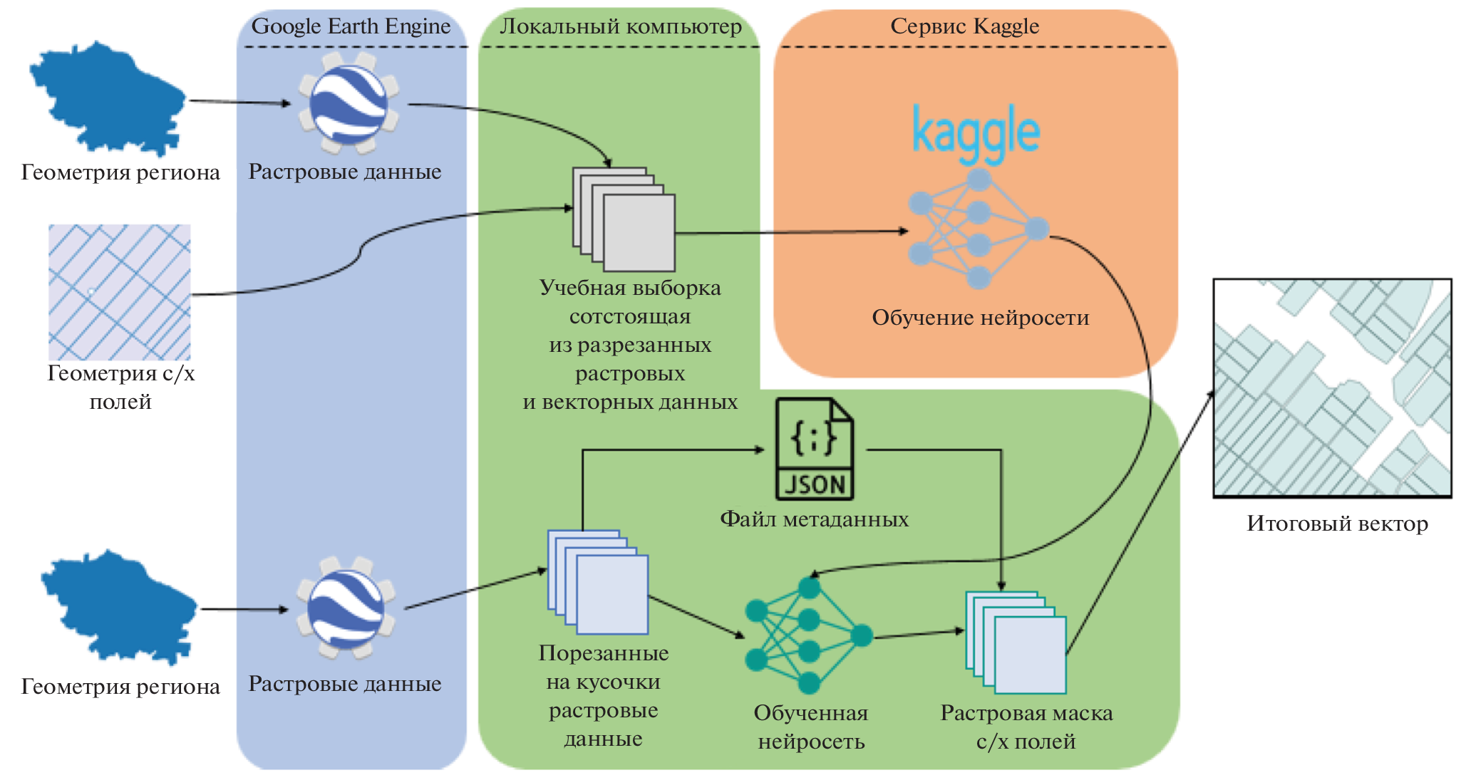 In recent years, research has been conducted in scientific institutions of the Ministry of Agriculture of the Russian Federation and the Russian Academy of Sciences on the introduction into practice of new technologies for the use of aerospace information in agriculture. The article, using the example of the Stavropol Territory, considers the possibility of using cloud services such as google earth engine (GEE) and Kaggle machine learning systems for mapping agricultural (agricultural) fields using deep learning methods based on remote sensing data. Median images of the Sentinel 2 space system for the 2022 growing season were used as data for the selection of training and validation samples. The total volume of the prepared training and training samples was 3998 images. One of the problems for researchers and manufacturers in the field of agricultural is the lack of centralized and verified sources of geospatial data. Deep learning methods are able to solve this problem by automating the task of digitizing the geometries of agricultural fields based on remote sensing data. One of the limitations in the widespread use of deep learning is its high demand for computing resources, which are not yet always available to a researcher or manufacturer in the field of agricultural. The paper describes the process of preparing the necessary data for working with a neural network, including correction and obtaining satellite images using the Google earth engine platform, their further standardization for training a neural network in the Kaggle service, and its further use locally. As part of the study, a neural network of the U-net architecture was used. The final classification quality was 97%. The threshold of division into classes according to the classification results was established empirically and amounted to 0.62. The proposed approach made it possible to significantly reduce the requirements for the local use of PC computing power. All the most resource-intensive processes related to the processing of satellite images were performed in the GEE system, and the learning process was transferred to the resources of the Kaggle system. The proposed combination of cloud services and deep learning methods can contribute to a wider spread of the use of modern technologies in agricultural production and scientific research.