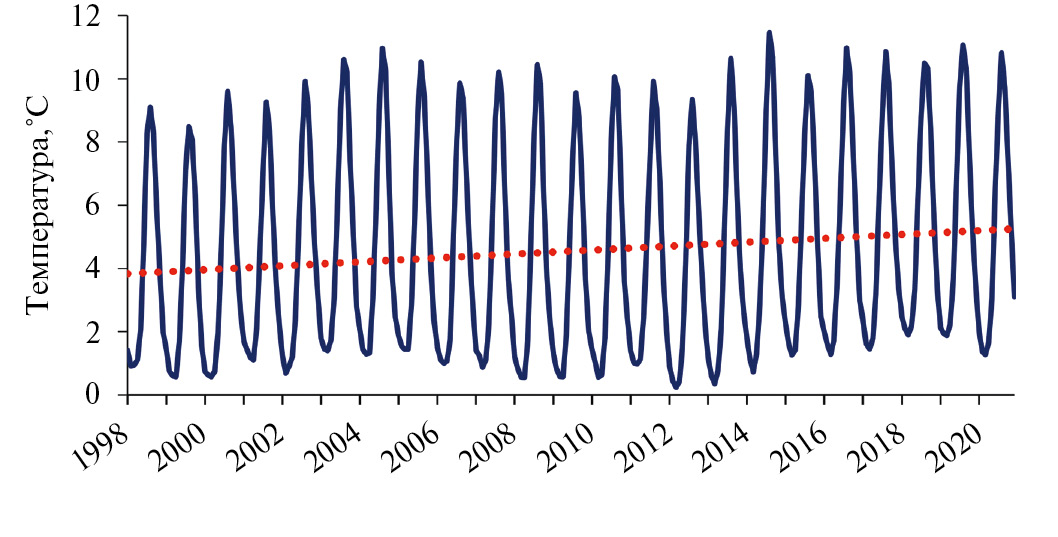 Рис. 3. График усредненных по акватории Берингова моря значений ТПМ за 1998–2021 гг. Красными точками показана линия тренда, рассчитанного методом наименьших квадратов.